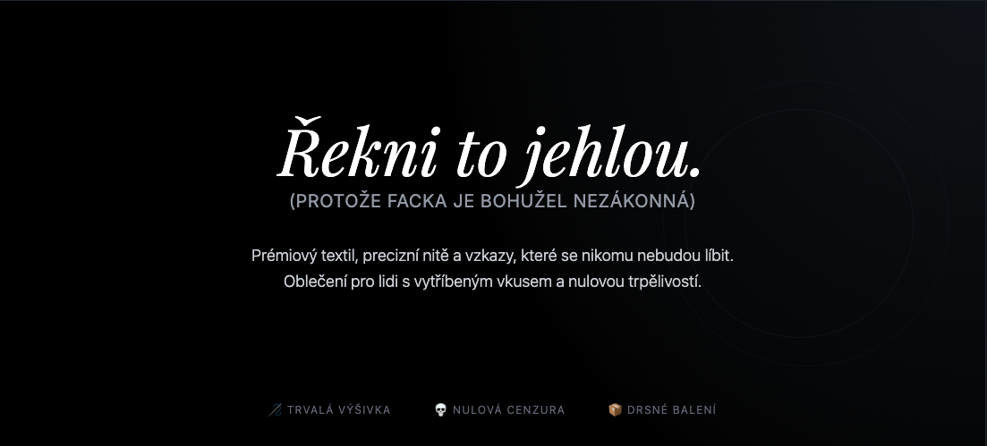 Hledáš levný potisk a motivační citáty o lásce? Jsi špatně. Zkus to vedle. Tady vládne sarkasmus, upřímnost a 100% bavlna. Děláme prémiové výšivky pro lidi, kteří mají plné zuby idiotů, korporátních keců a pozitivních vibrací. Jsme drazí, jsme sprostí a je nám to jedno.